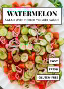 This watermelon salad recipe is SO delicious and refreshing! It features ripe cubed watermelon over mint-basil yogurt sauce, with cucumber and fresh herbs.
